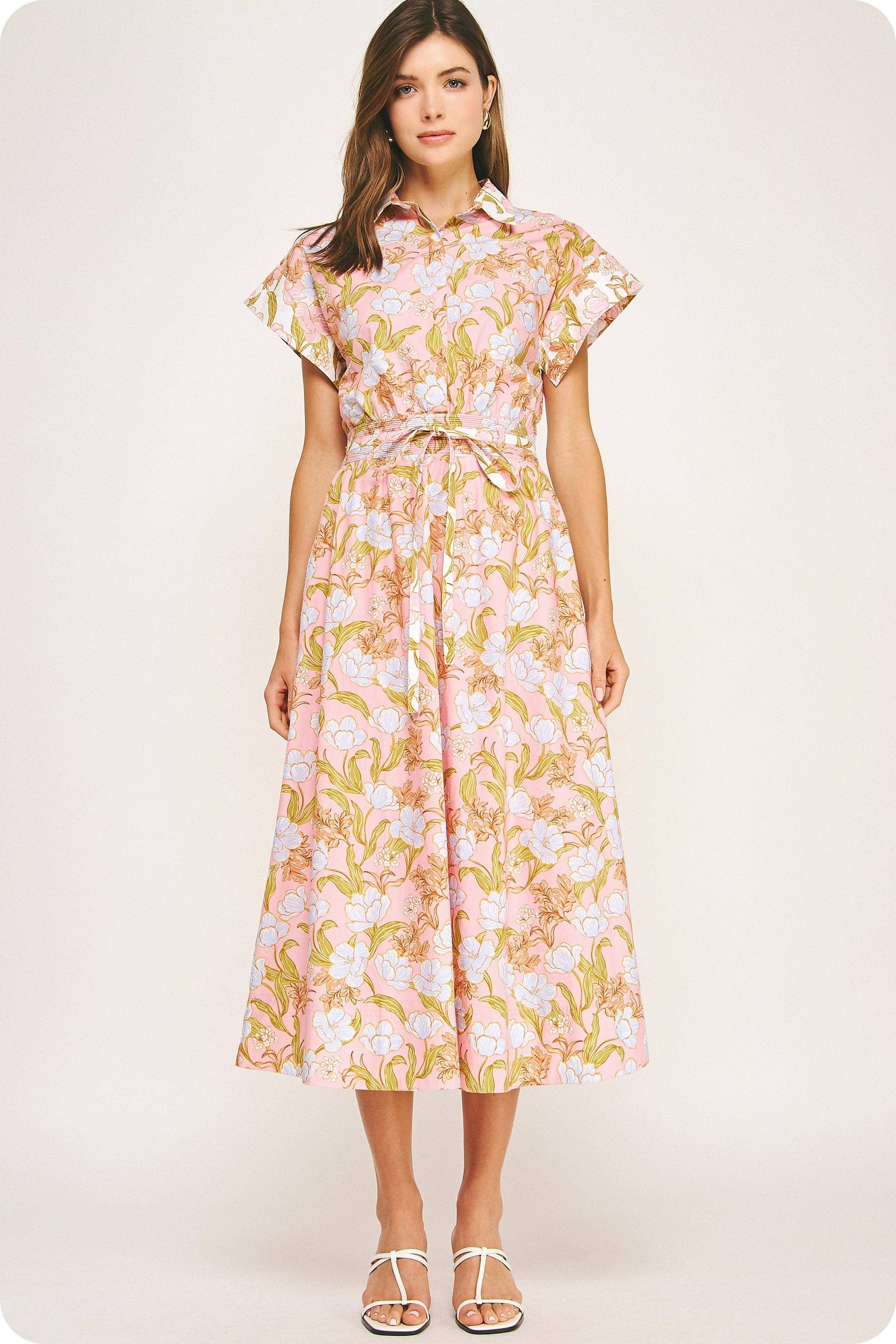 The Harper Floral Midi Dress showcases an exclusive floral print on soft cotton poplin. This elegant sundress features a quilted, cinched waist with stretch smocking at the back and a detachable waist tie belt for a tailored fit. Designed with practical side pockets, a button-down placket, spread collar, and short wing sleeves accented by contrasting cuffs, it offers both style and comfort. The dress is fully lined and finished with a relaxed A-line midi skirt and refined topstitch detailing on the sleeves.