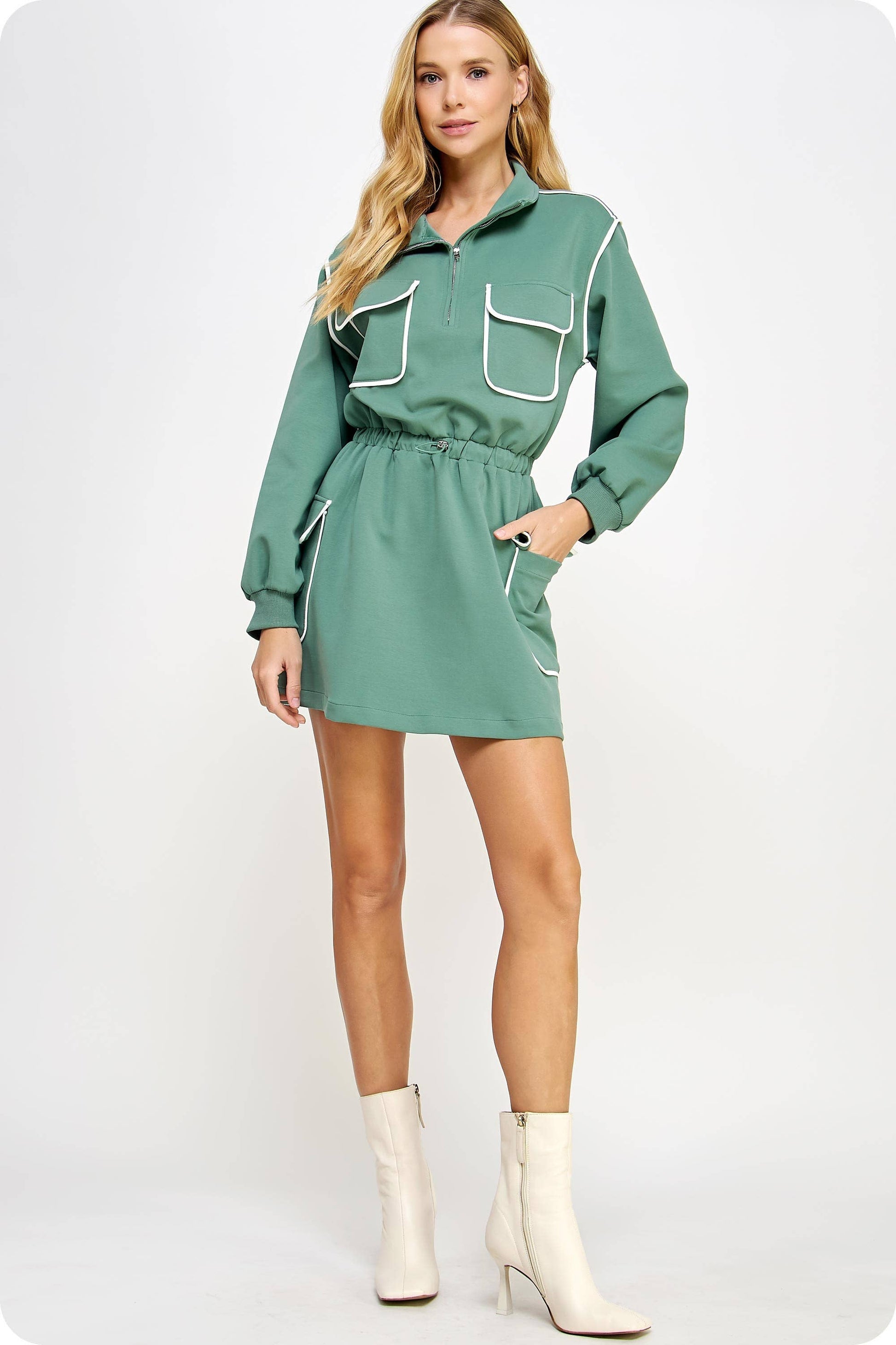 The Elle Mini dress has piping contrast detail cargo mini dress in stretch knit fabric. This style features elasticated waist with drawstring spring clasp, flap chest pockets, flap cargo side pockets, long sleeve with ribbed cuff, piping detail throughout, and half zip-up closure at front with stand collar.