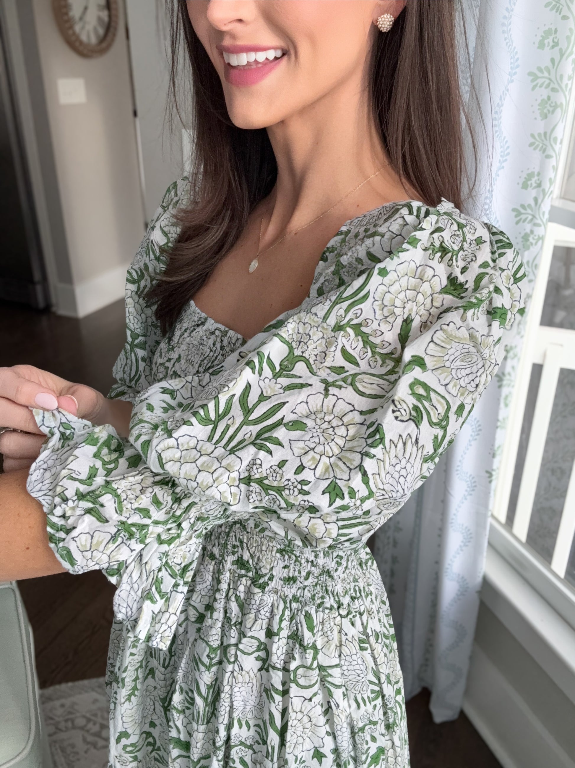 Effortlessly elegant, the Hampton Green maxi dress pairs soft sage and cream tones with charming 3/4 balloon sleeves that taper at the wrists. The fitted, stretchy bodice flows into a graceful A-line skirt that skims your ankles, while two hidden pockets keep your essentials close. Crafted from 100% organic cotton with a breathable voile lining,