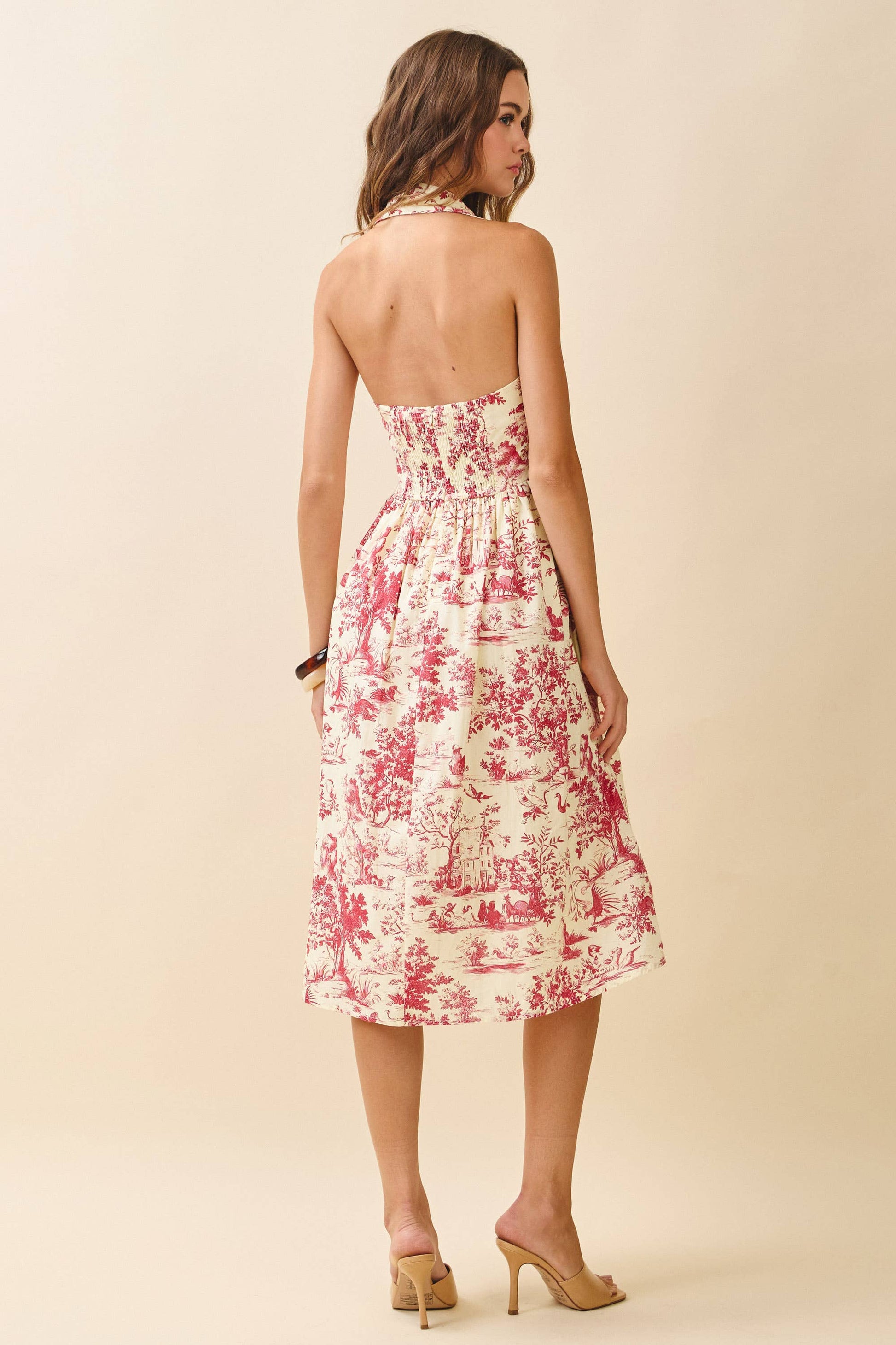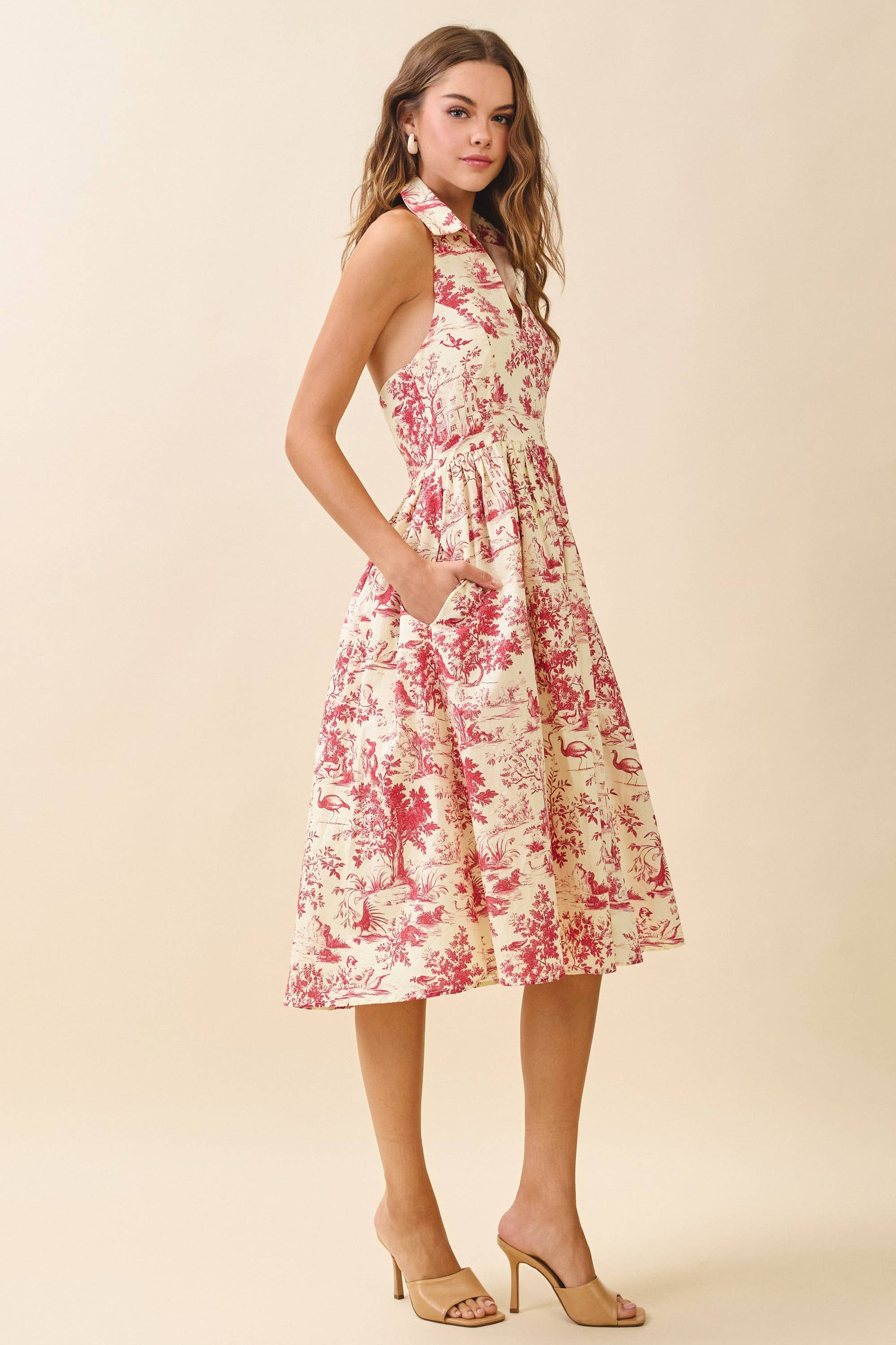 The Josephine Collard Halter Midi dress boasts a daring split neckline paired with a bold wide collar, hugging a fitted bodice that flows into a playful pleated skirt. Covered in an abstract print, it’s finished with handy side pockets and a stretchy smocked back for a comfy, flattering fit. This stunning dress comes in a rich Burgundy toile set against a creamy backdrop.