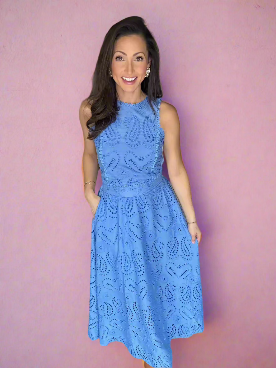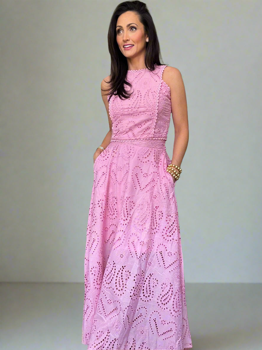 Indulge in the ultimate vacation ensemble with The Taylor Embroidered Lace Set. This luxurious set features a fully lined top and partially lined skirt, creating a lightweight and versatile look. Offered in Pink or Blue.